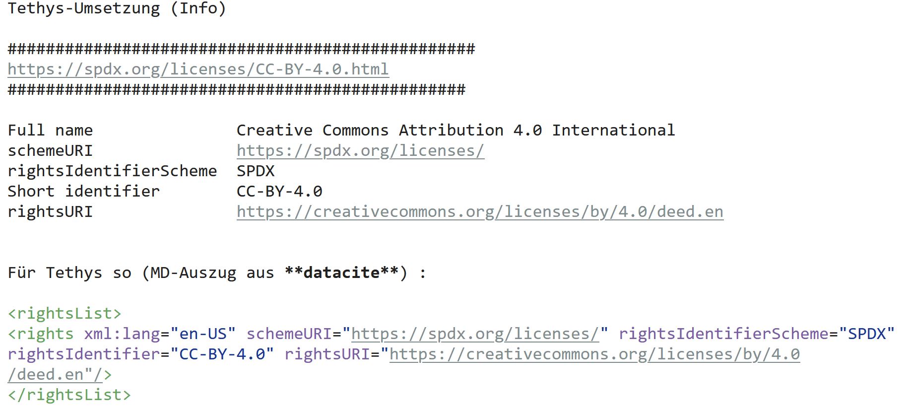 bei der Durchsicht der Tethys Datensätze (datacite Format) ist mir aufgefallen , dass die „rightsURI= https://creativecommons.org/licenses/by/3.0/de/deed.de“ der „rightsIdentifier“ und der Beschreibungstext nicht zusammenpassen. Wenn Du die aktuelle rightsURI auflöst, verweist diese auf Deutschland mit einer 3:0 Lizenz