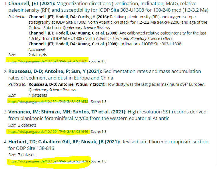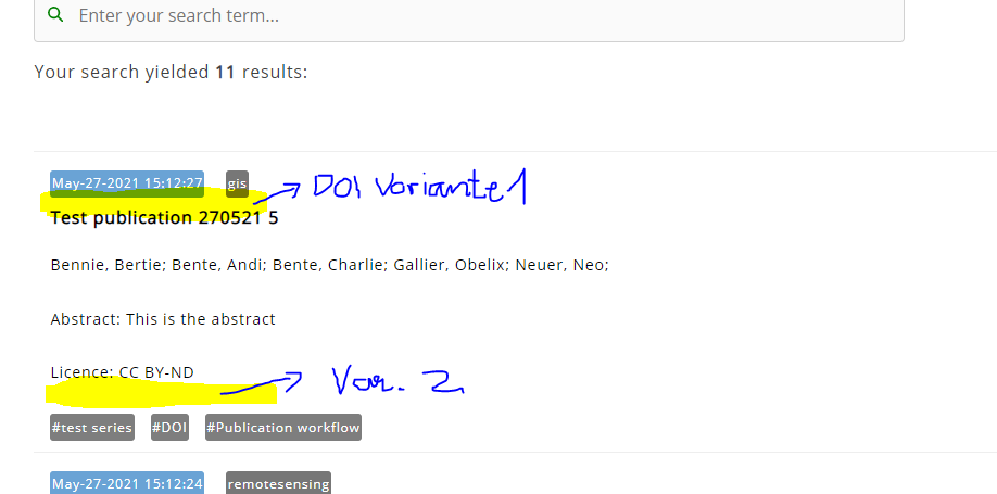 Wenn möglich die DOI auch im Search sichtbar darstellen, ähnlich wie bei pangaea.de (siehe Screenshot 1). Entweder packen wir die vollständige DOI oberhalb des Titels oder nach Licence (Screenshot 2). Ich würde die erste Variante bevorzugen.